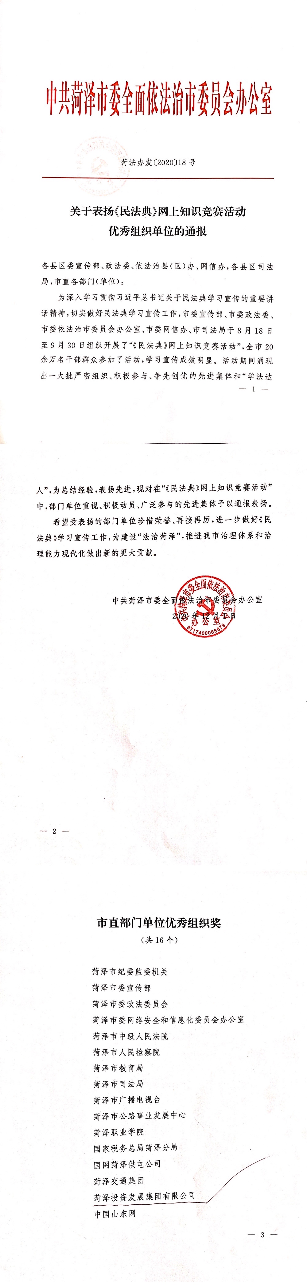 菏投集團(tuán)公司于8月18日-9月30日積極參與了由市委宣傳部、市委政法委、市委依法治市委員會、市委網(wǎng)安委員會、市司法局五部門聯(lián)合舉辦的《民法典》網(wǎng)上知識競賽活動,通過多種形式開展《憲法》《民法典》等學(xué)習(xí)活動,廣泛動員、精心組織,榮獲全市“《民法典》網(wǎng)上知識競賽”優(yōu)秀組織獎和“學(xué)法達(dá)人”優(yōu)秀推薦單位。