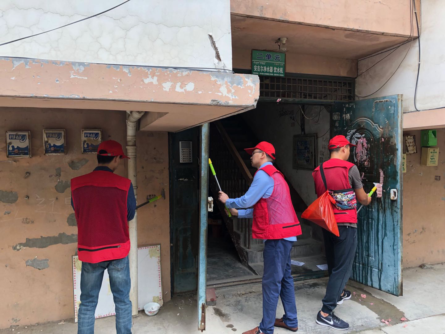 菏投集團志愿者們仔細鏟除小區(qū)內墻面上的小廣告